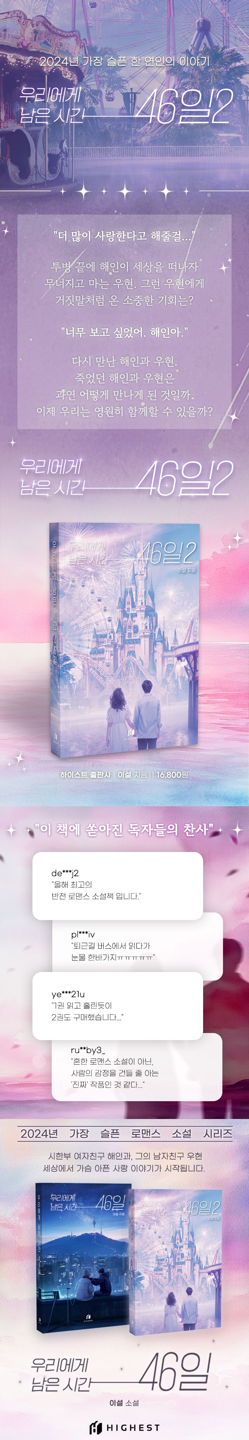 〈우리에게 남은 시간이 46일 2〉 이 소설은 시한부인 해인의 곁에서 슬퍼하며, 끝까지 사랑과 지지를 아끼지 않는 우현의 슬픈 사랑이야기를 담고 있다. 마지막까지 절대 포기하지 않는 그들의 사랑은 독자의 마음을 짙게 울릴 것이다. 이 책은 우리에게 삶의 소중함과 사랑의 힘을 되새기게 해주는 인상적인 작품이다.